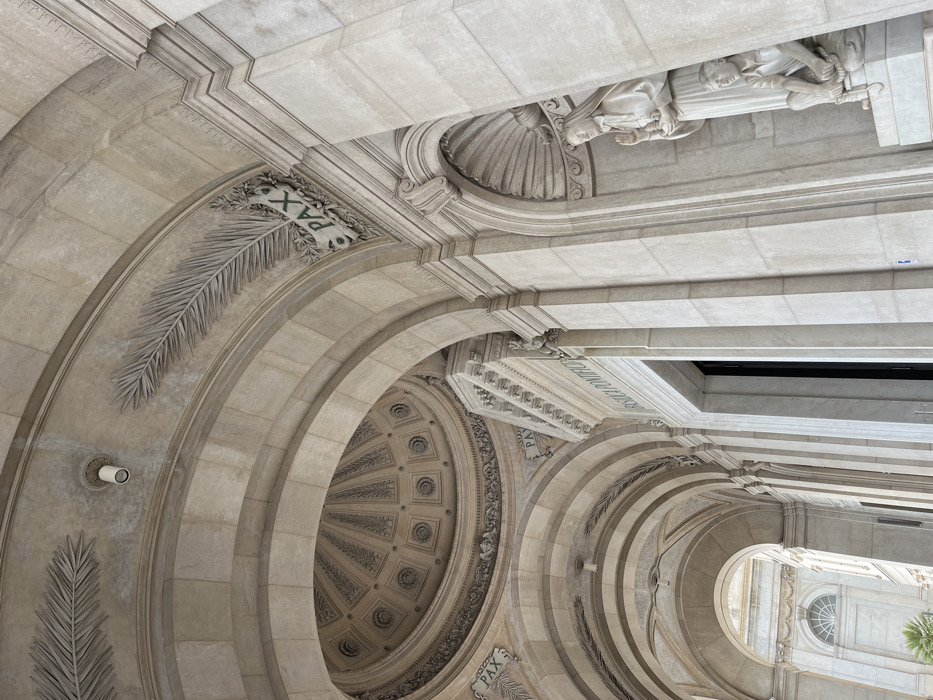 The image depicts the exterior of the Pontifical Shrine of the Blessed Virgin of the Rosary of Pompei (Pontificio Santuario della Beata Vergine del Santo Rosario di Pompei) in Pompei, Italy. The scene is an upward-angled view of a grand stone architectural structure featuring multiple receding arched porticos constructed from light-colored stone. The undersides of the arches are adorned with carved palm frond motifs, and the Latin word "PAX" is inscribed within decorative elements on two archways. A central, intricate coffered dome is visible through the arches. A small, white, cylindrical security camera is mounted on the ceiling of one of the archways. To the right, within a shell-decorated niche, stands a white marble statue group on a stepped pedestal. The primary figure is a robed and veiled female, standing with her right hand raised in a gesture and her left hand holding an object, possibly a rosary. Below and in front of her, a male youth kneels, focused on securing something around his lower leg. The inscription "BASILICA PONTIFICIA" is visible above a dark, recessed entranceway. In the distant background, beyond the main arches, another stone building with an arched window and a palm tree are partially visible. The scene is uniformly illuminated by natural light.