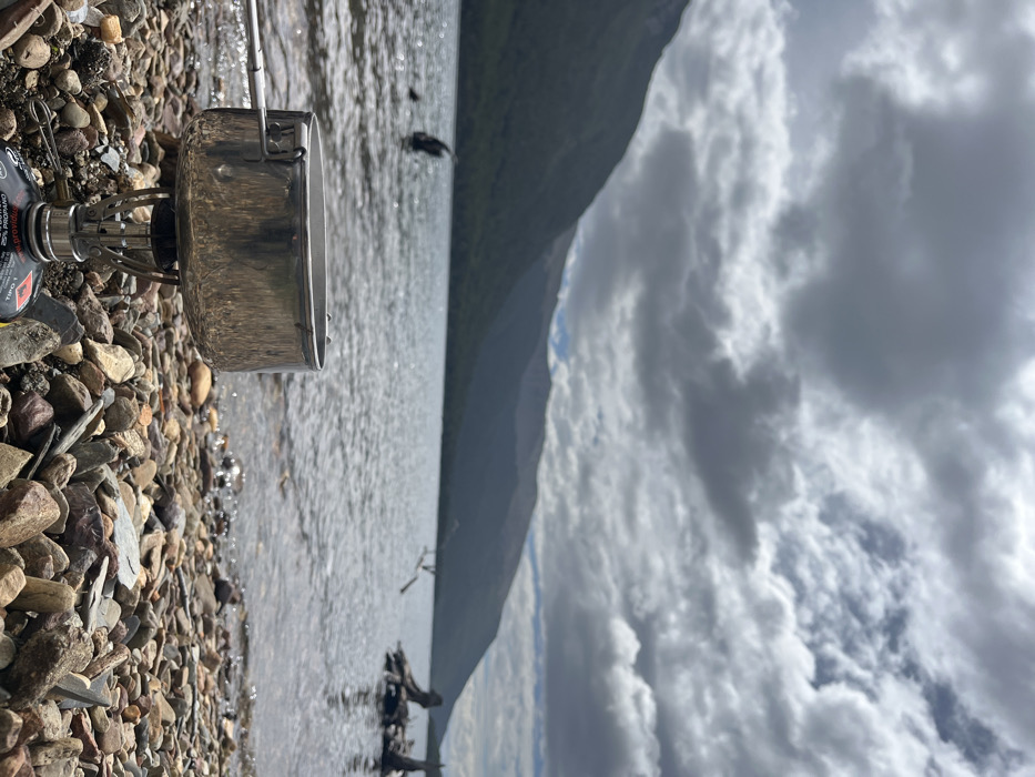 A metal pot sits on a portable stove on a rocky shore. A body of water stretches toward a distant mountain range under a sky dominated by heavy, textured clouds. The scene is shot from a low angle, emphasizing the foreground textures of the pebbles and the sheen of the pot against the broader, more distant landscape.
