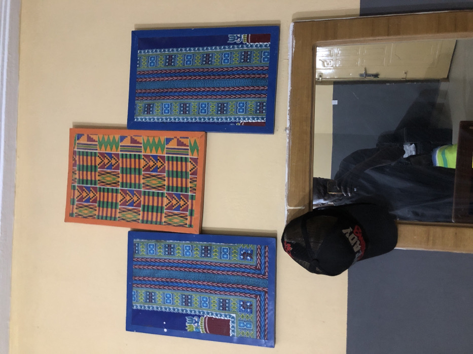 A wall exhibits three framed artworks: two blue frames displaying symmetrical patterns in shades of blue, green, and red; one orange frame showcasing a colorful geometric pattern with orange, green, and blue