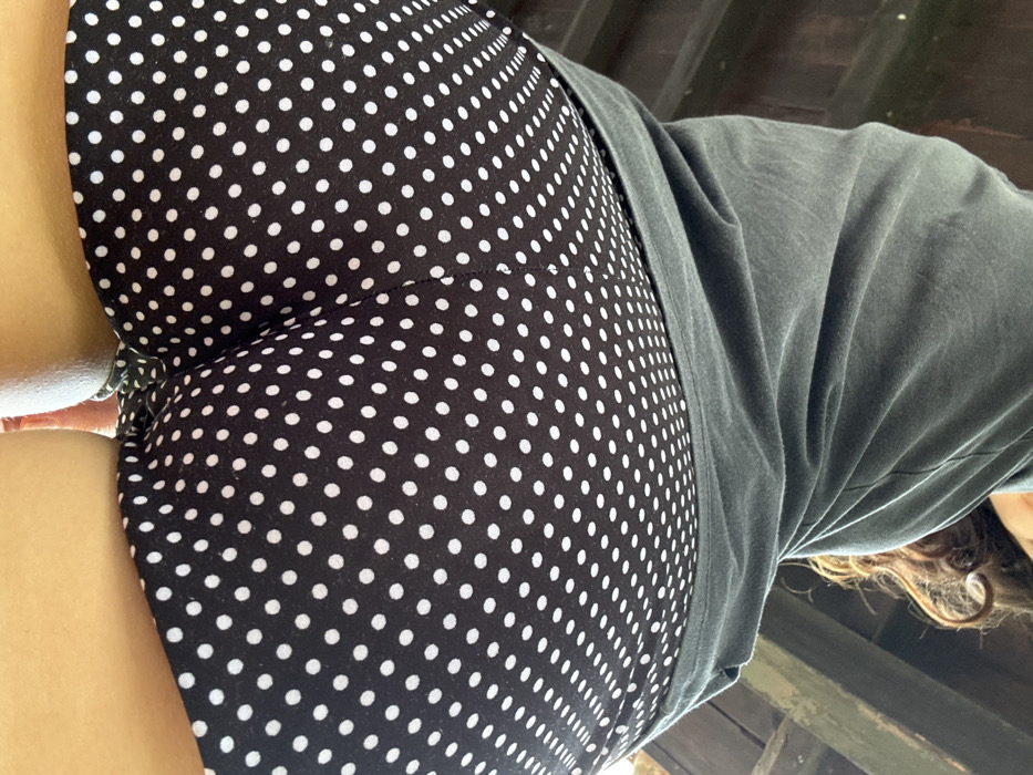 A low-angle shot depicts a person wearing a black and white polka dot dress or skirt paired with a gray t-shirt or cardigan. Part of their face and curly brown hair are visible. The angle gives an upward perspective of the outfit, with the polka dot pattern prominently displayed. Skin is visible on the left side of the frame. The photo is well-lit and provides a close-up view of the clothing.