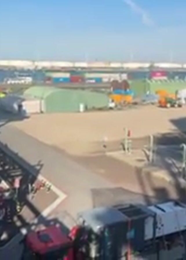 wide shot of an industrial area, likely a port or refinery