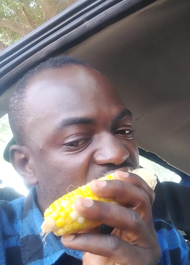 A man is inside a car holding a piece of corn