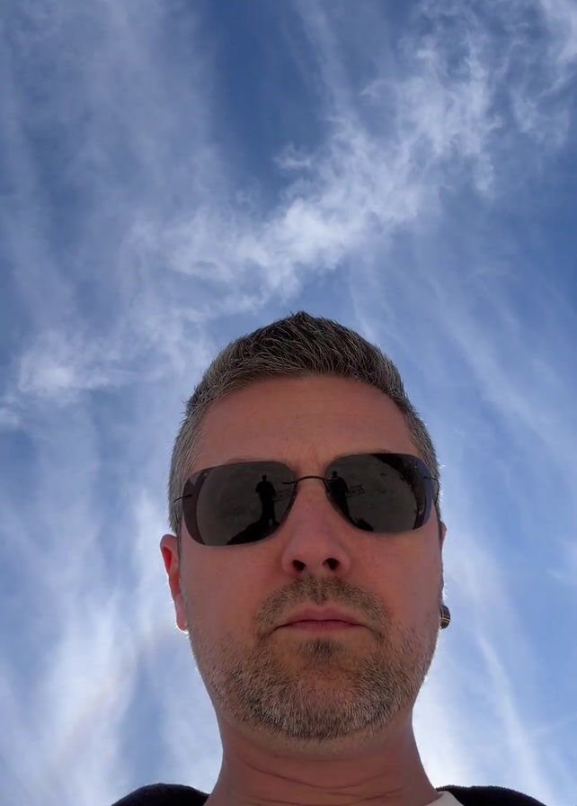 close-up, low-angle shot of a man wearing sunglasses. The man has short, graying hair and a light beard. He is wearing a white shirt with a black jacket. Reflected in his sunglasses is a person standing. The background is a bright blue sky with wispy white clouds. There is a faint rainbow visible in the upper left corner of the frame. The man is looking directly at the camera.