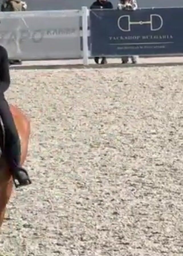 A woman is riding a horse in an arena. The horse is chestnut-colored with a white blaze on its face. The rider is wearing a black riding outfit and a helmet. The arena has a gravel surface, and there is a banner in the background that reads "Tackshop Bulgaria" with a horse bit logo. People are observing from behind the banner. Another banner reads "Andersen". The horse is walking, and the rider is holding the reins.
