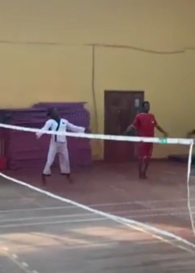In a well-lit indoor gymnasium, three young men are exercising near a badminton net. On the left, a person dressed in a white martial arts uniform is performing arm stretches. To the right, a person in a red t-shirt and red shorts is seen mirroring the same stretches. Further to the right, a third individual in a dark long-sleeved shirt and white pants is also participating in the exercise. Piles of purple mats are stacked behind the person in white on the left. The gym has a yellow wall with a dark-colored door and visible windows.