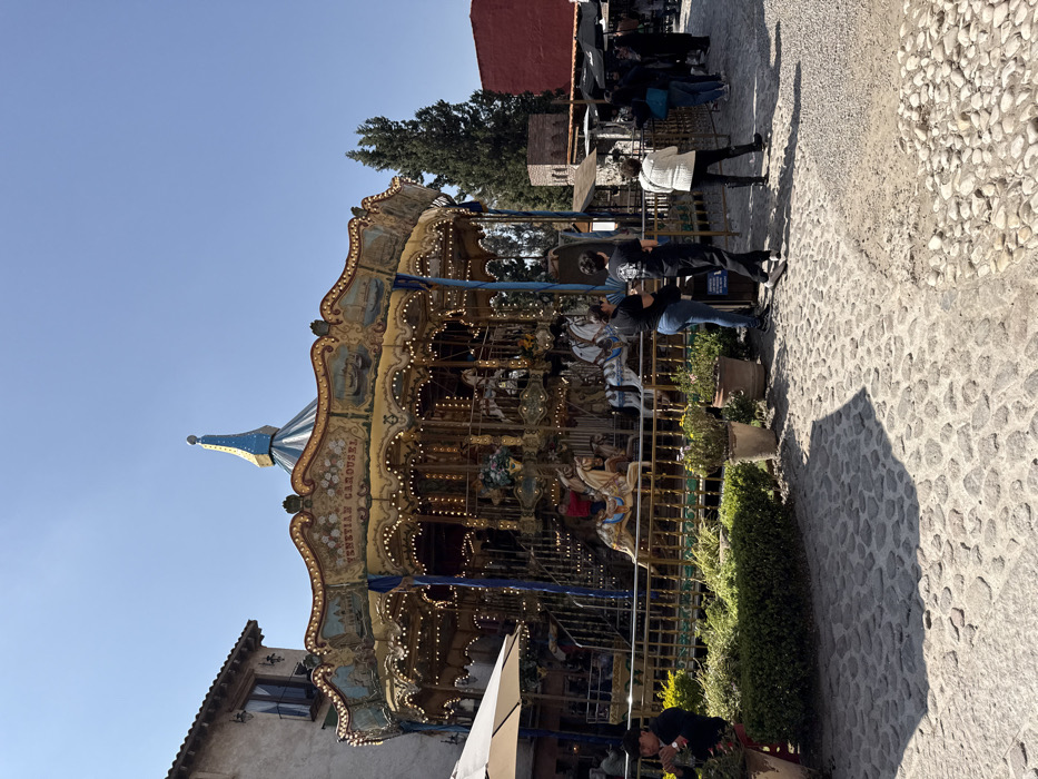 A vibrant Venetian carousel dominates the scene under a clear sky. Its ornate details are visible, including decorative horses and illuminated features. People stand nearby, adding to the lively atmosphere. The carousel is nestled amidst greenery and architecture, and the cobblestone ground adds texture to the foreground. The warm sunlight casts shadows, enhancing the depth and visual appeal.