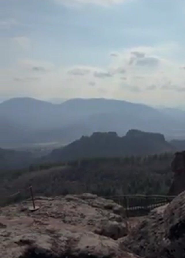 From a high vantage point, the video shows a panoramic view of a mountainous landscape under a sky dotted with clouds. The foreground consists of a rocky terrain with occasional patches of reddish soil. Several large rock formations stand prominently, some appearing as pillars or stacks. A low metal railing provides a safety barrier along certain edges. In the midground, a dense forest blankets the area between the viewer and the distant mountains. Beyond the forest, layers of mountains fade into a hazy blue, creating a sense of depth. A solitary tree, appears to be a coniferous species, standing prominently at the edge of the rocks. The tree's branches are partially bent. The camera pans slowly, revealing more of the landscape and emphasizing the vastness of the natural setting.
