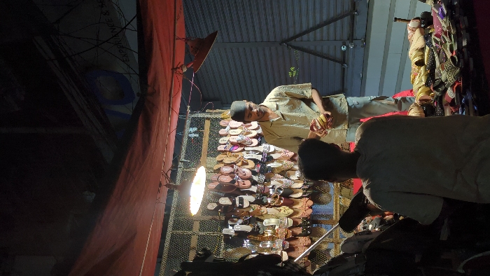 Two men stand near a display of sandals. One man wears a tan shirt and a black kufi, holding a striped object, seemingly engaged in a transaction. The other man, in a light-colored shirt, bends over, looking at the sandals. The sandals are displayed vertically on a wire rack with a bright light shining on them. To the left, there's a red curtain-like backdrop. Overhead, a corrugated metal roof is visible. The scene appears to be a market setting.