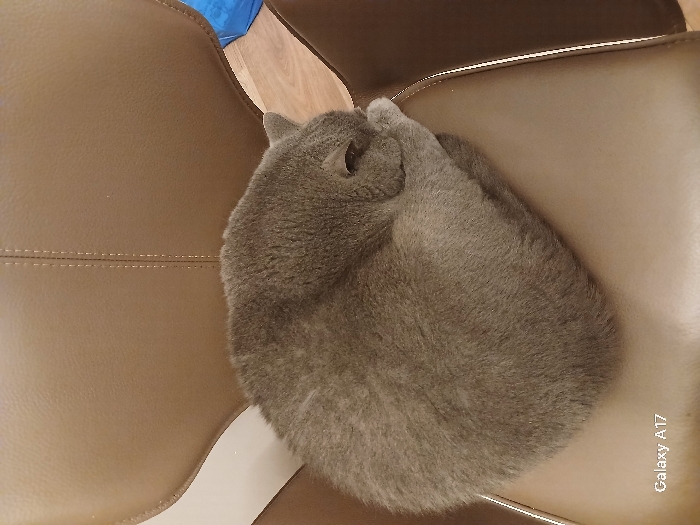- "A grey-furred cat is observed curled tightly, resting or sleeping, on a tan-colored chair" by FM-MZ8Xp1, licensed under CC BY 4.0