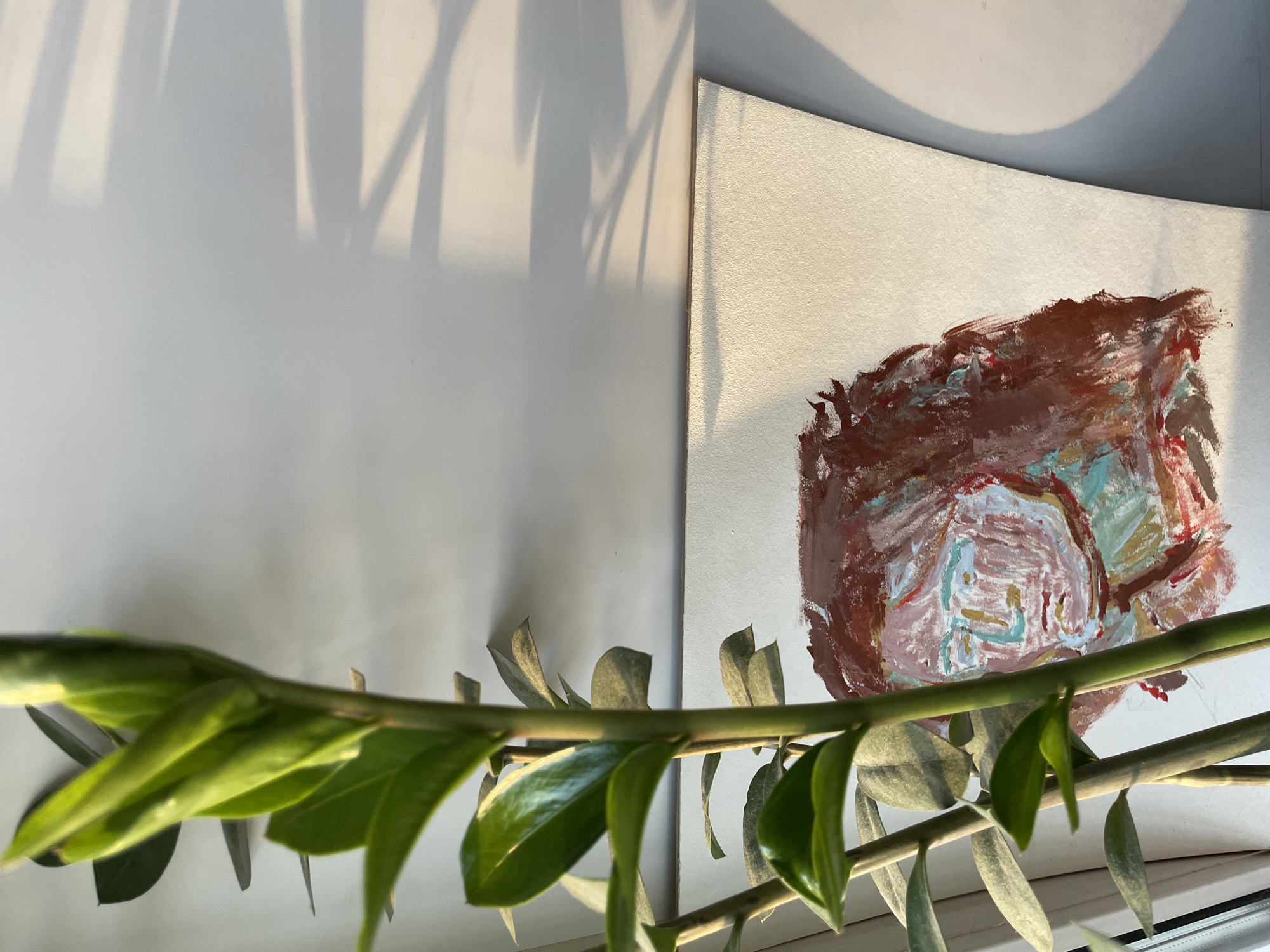 still life arrangement. In the foreground, a stem of a Zamioculcas plant with glossy green leaves runs horizontally. Behind the plant, to the right, is a white canvas with an abstract painting in shades of brown, red, and teal. To the left of the canvas is a plain white wall with the shadow of another plant, possibly the same Zamioculcas, cast upon it. The lighting appears to be natural daylight. The location in Yekaterinburg, Russia is not discernible from the image. There are no people visible. The scene appears to be indoors, likely in a home or studio.