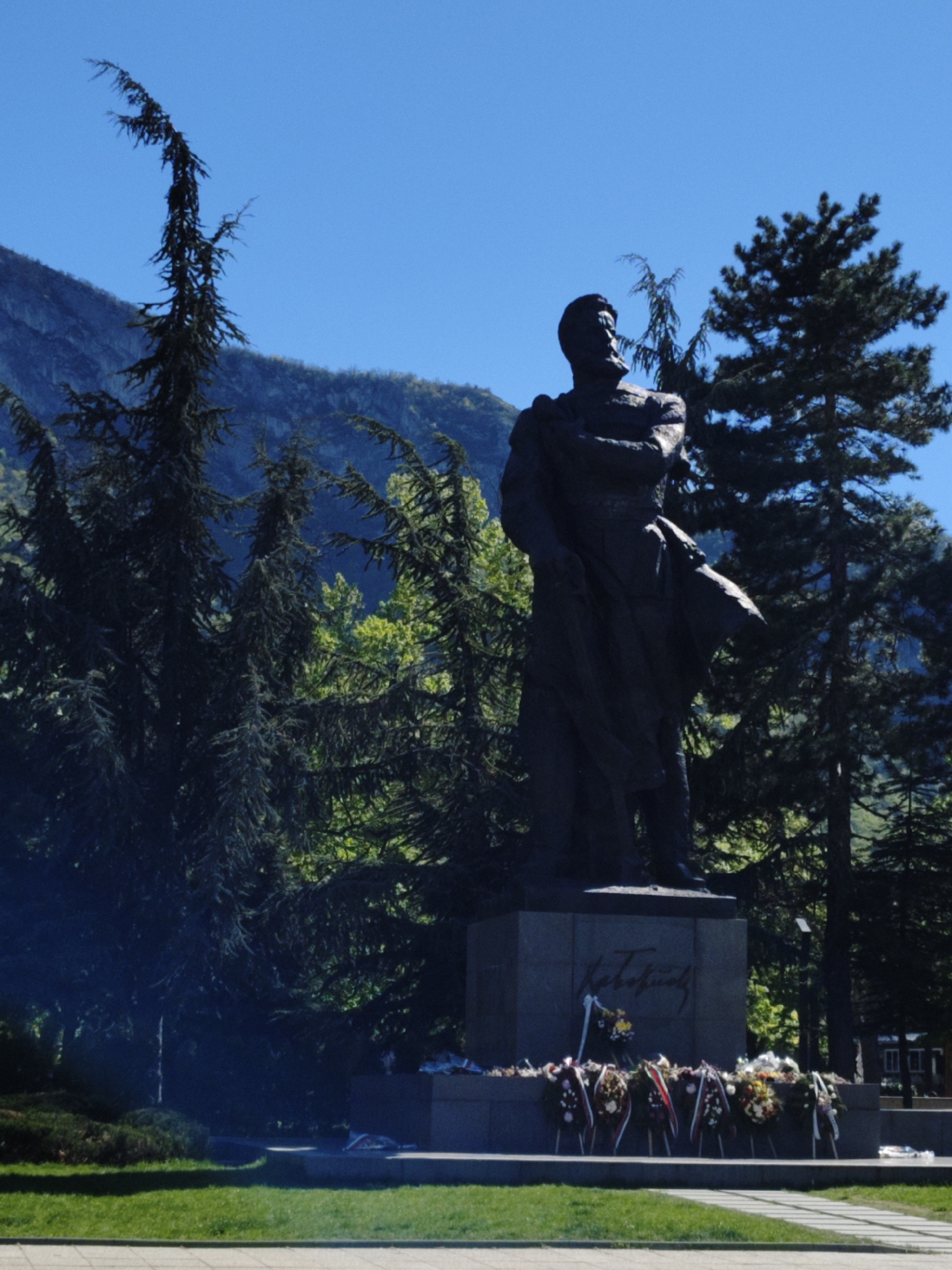 statue of Hristo Botev in Vratsa, Bulgaria. The statue stands on a stone pedestal in a park-like setting. Wreaths adorn the base of the statue. Tall trees frame the statue, with a mountain visible in the background under a clear blue sky. A grassy lawn is in the foreground.