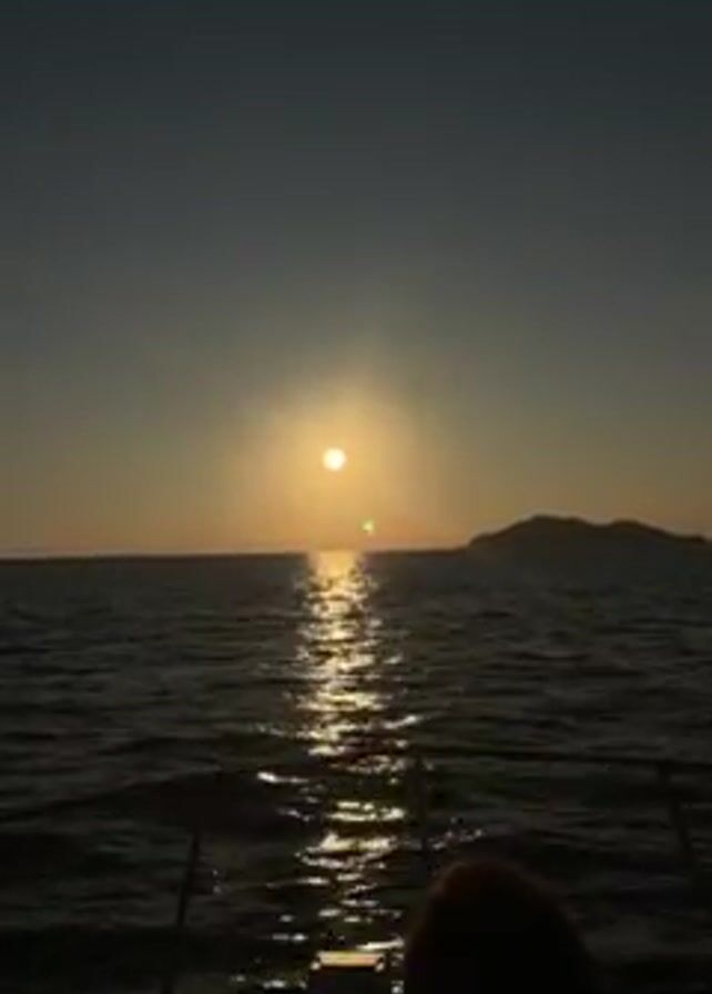 sunset over the ocean, as viewed from a boat. The sun is low on the horizon, creating a bright reflection on the water. A small, hilly island is visible in the distance. The sky is clear and dark, with the silhouette of the head of a person visible in the foreground. The video is somewhat shaky, likely due to the movement of the boat. Music plays in the background.