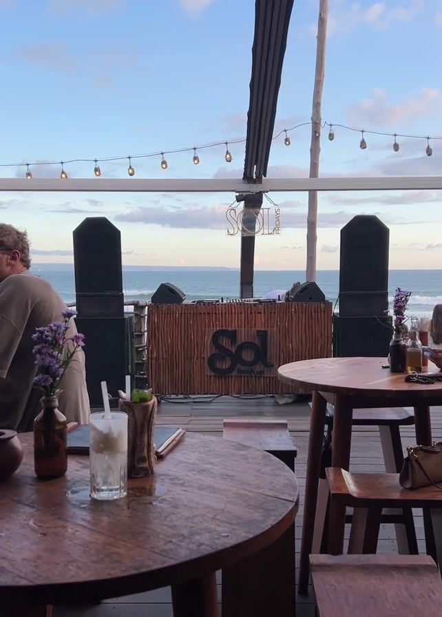 The camera pans slowly from left to right inside an open-air beach bar. The foreground is dominated by two round wooden tables, set with drinks, phones, and flowers in small vases. A man wearing a beige shirt is partially visible on the left of the frame. Behind the tables, there is a DJ booth made of wooden sticks with the words "Sol Rooftop" written on it. A DJ with long hair and headphones, wearing a white T-shirt, is mixing music behind the booth. Two large speakers flank the booth. The background reveals the ocean and a partly cloudy sky. A string of lights hangs across the frame, adding to the ambiance. The overall setting is relaxed, suggesting a beachside music event.