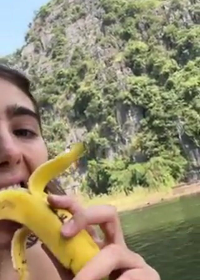 A woman with dark hair and fair skin stands on a boat and eats a banana