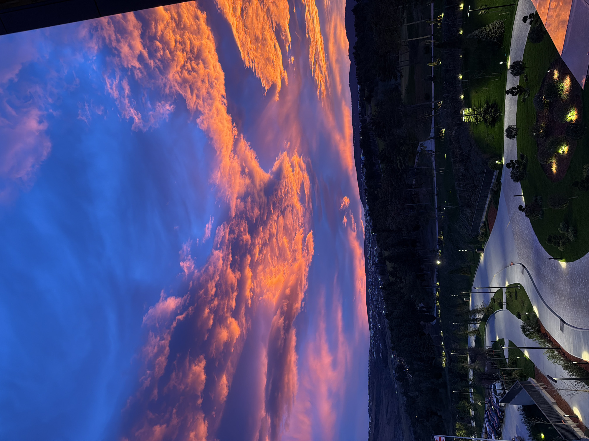 The image depicts a twilight scene from an elevated vantage point in Tbilisi, Georgia, overlooking a developed, landscaped area and distant hills. The sky occupies the upper two-thirds of the frame, displaying a deep blue at the zenith, transitioning through purples and pinks to intense orange and red hues along the horizon, indicative of a sunset. Fragmented and layered stratocumulus clouds are prominently illuminated with these vibrant colors. Below the horizon, distant hills are silhouetted against the colorful sky, with scattered lights indicating residential structures on their crests. The mid-ground features an extensive expanse of dark green tree cover, consistent with a forest or large park, across rolling terrain. In the foreground, a meticulously maintained artificial environment is present. Light-colored paved pathways or roads snake through manicured green lawns, interspersed with ornamental shrubs and small trees. Numerous modern, dark-colored streetlights and ground-level accent lights illuminate these pathways and planted areas, casting warm glows. To the lower left, a parking lot with several dark-colored vehicles is partially visible behind a fence. A white flag with a prominent red cross, identified as the national flag of Georgia, is displayed on a flagpole near the parking area. No human subjects or discernible actions are present within the scene. A dark structural element, possibly part of a building, is visible along the right edge of the frame, suggesting the viewpoint is from a building's balcony or window.