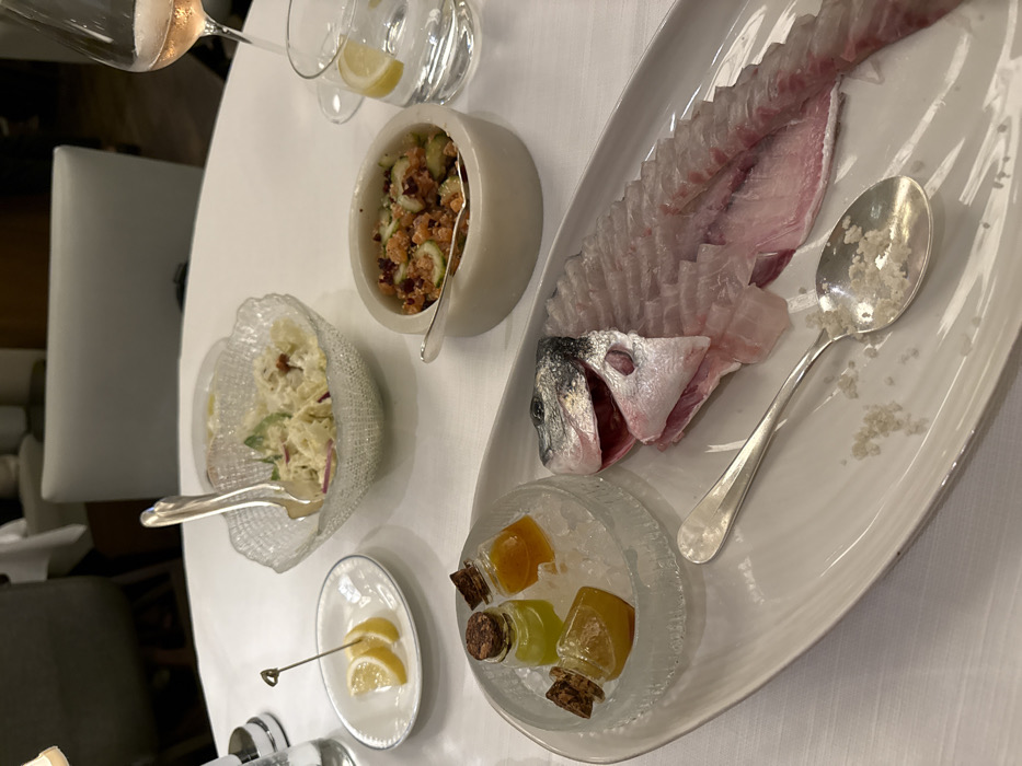 A high-angle shot depicts a curated meal on a white tablecloth. A plate features thinly sliced raw fish with its head intact, served with a spoon coated in crystals, and small bottles in ice. A salad is presented in a glass bowl, with a smaller bowl containing a mixture of finely chopped ingredients. A small plate holds lemon slices pierced by a metal pick, and stemware, including a wine glass with rosé, complete the setting.