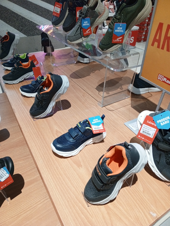 The image displays a retail shoe display in an indoor setting. Multiple pairs of new athletic shoes, primarily sneakers, are arranged on two levels. The upper level features adult-sized shoes, including dark grey, light grey, and olive green sneakers, each bearing "Lubrene" brand tags, some marked "NEW ARRIVAL." These shoes are presented on clear acrylic stands. The lower level, a wooden-textured surface, showcases smaller shoes, likely children's sizes, predominantly dark blue and dark grey/black sneakers with bright orange interior linings and white soles. These smaller shoes utilize Velcro straps for closure and are also tagged with "Lubrene" and either "NEW ARRIVAL" or "PRODUK BARU" (Indonesian for "New Product"). Some shoes on the lower level are individually supported by small clear acrylic risers. A large, partially visible orange sign on the right displays "AR" in white text and an "R" logo, suggesting a brand or department name. The background is blurred, showing additional retail shelving and a patterned floor. No individuals are visible in the scene. The image does not contain sufficient visual information to determine its specific location within the city of Sandhikharka, Nepal.