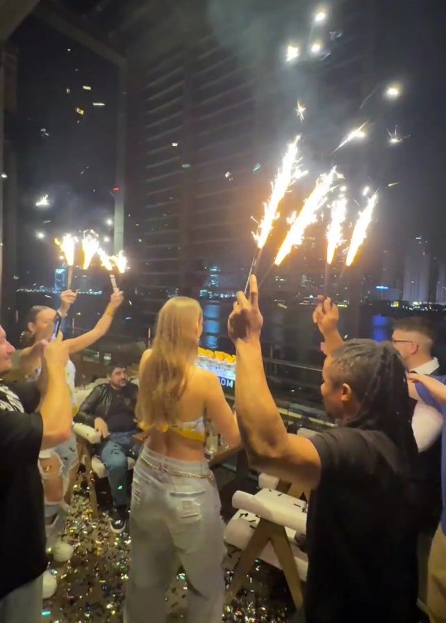 The scene shows a group of people celebrating at night on a rooftop or high-rise balcony, possibly at a bar or lounge. The atmosphere is festive, with sparklers being held aloft and confetti scattered on the ground. The people in the group appear to be Caucasian, Black, and Asian, dressed casually, and are celebrating with music, cake, and drinks. In the background, there is a cityscape with lit-up buildings reflecting on the water. A man is sitting in the corner, seemingly uninvolved in the celebration.