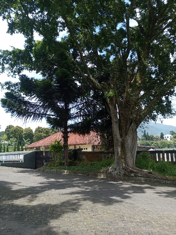 The image depicts an outdoor scene in Vieng Phouka, Laos, under a bright, sunlit sky. The foreground features a dark grey, interlocking paver surface, exhibiting wear and cracks, overlaid with prominent, irregular shadows cast by overhead trees. A low concrete curb separates this paved area from a strip of green grass and smaller plants. To the right, a large, mature tree with a thick, multi-stemmed trunk and substantial exposed root system dominates the mid-ground. Its branches are dense with green foliage, and sections of its trunk show epiphytic growth, including ferns and vines. To the left of this tree stands a narrower, conifer-like tree with dark green, needle-like foliage. Behind the trees, a single-story building with a reddish-brown tiled hip roof and light-colored walls is visible. Multiple small, square windows are set into its facade. In front of this building, a dark metal gate and a grey wall form a barrier. Further right, behind the large tree, a white slatted fence is partially discernible. The background consists of rolling hills covered in dense green vegetation, with sections of blue sky and scattered white clouds visible through the tree canopies. No individuals are present, and no discernible actions or interactions are occurring.