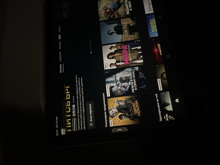 The image displays a digital screen, likely a television or tablet, in a dark indoor environment, illuminated primarily by the screen itself. The screen shows the HBO Max streaming service interface, set to Bulgarian language. The time displayed in the top left corner is "20:57 Sat 14 Mar." The main content area features the title "ПИТСБЪРГ" (Pittsburgh), indicating it is a television series. Below the title, it states "НОВ ЕПИЗОД" (New Episode) and "2 сезона" (2 seasons). A description in Bulgarian reads: "Персоналът на Травматологичния медицински център в Питсбърг работи денонощно, за да спасява животи в пренаселено и недофинансирано спешно отделение." (The staff of the Traumatology Medical Center in Pittsburgh works around the clock to save lives in an overcrowded and underfunded emergency department.) A button labeled "Към сериала" (To the series) is visible. Below this, a section titled "Популярни предложения" (Popular suggestions) presents various show thumbnails, including "ХВАНАТ В КРАЖБА" (Caught in the Act), "ЛЮБОВ В ПОВЕЧЕ В СЕЙНТ ЛУИС" (More Love in St. Louis), "МИРА с вдигната глава" (Mira with her head held high), "ТОЗИ ГРАД" (This City), and "ПАДИНГТЪН В ПЕРУ" (Paddington in Peru). Further down, a section "Препоръчано за теб" (Recommended for you) includes titles such as "NAKED AND AFRAID" and "ПРИЯТЕЛИ" (Friends). The prevalence of Bulgarian language indicates the user is located in Bulgaria, consistent with the specified city of Vidin. No individuals or specific objects beyond the screen are discernible within the frame.