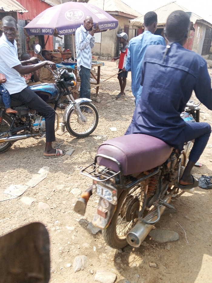 The image depicts a bustling street scene in New Karu, Nigeria, under bright daylight. In the immediate foreground, the rear of a black motorcycle with a purple padded seat is visible, featuring a metal cargo rack, a worn license plate (partially obscured, showing "D13"), and an exposed exhaust pipe. The rider, whose lower legs and feet in dark flip-flops are seen, is seated facing away from the camera. To the left of this motorcycle, a light blue motorcycle is stationary. A man in a light blue polo shirt, dark trousers, and striped flip-flops sits on it, looking towards the left side of the frame. A small child, wearing blue attire, is perched on the fuel tank in front of the man. In the midground, to the right of the light blue motorcycle, a man with a thin build, wearing a light-colored striped long-sleeve shirt and blue jeans, stands beneath a purple umbrella. The umbrella is branded with "42.5 OPC NORMAL" and text indicating "YIELDS MORE" and "SETS STRONGER." This man holds a dark object to his right ear, consistent with a phone call. Behind him, a makeshift stall with goods, possibly in baskets, is visible. Further to the right, a young boy in a red and white striped shirt and dark shorts stands, holding a wooden stick. Two other men, dressed in blue traditional garments, are observed from behind, facing away from the camera. The ground is unpaved, consisting of packed dirt and scattered stones and debris. In the background, simple buildings with corrugated metal roofs and light-colored walls indicate a commercial or residential area.