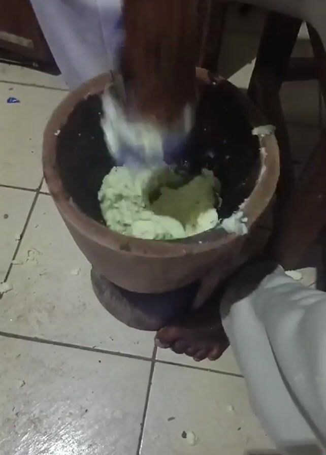 person pounding a light-green substance in a large, dark-brown wooden mortar with a wooden pestle. The person is wearing light-colored clothing and is barefoot. The mortar is sitting on a tiled floor. There is a dark-colored wooden cabinet visible in the background. Some of the substance has spilled onto the floor around the mortar. The person is repeatedly lifting the pestle and striking the substance in the mortar.