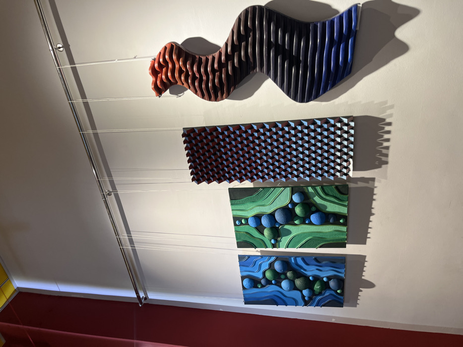 An interior scene depicts an art exhibition within a gallery space in Yerevan, Armenia. Four contemporary artworks are displayed on a light-colored wall, suspended from a horizontal silver metal rail near the ceiling by transparent lines. No people are visible. From left to right: the first artwork is a vertical rectangular panel featuring a relief of undulating blue and teal patterns integrated with spherical forms in various shades of blue and green. The second artwork, also a vertical rectangular panel, presents a similar relief composed of undulating green patterns and blue-green spheres. The third artwork is a vertical rectangular panel textured with a uniform array of small, blue-tipped pyramidal protrusions on a dark background. The fourth and rightmost artwork is a large, vertically oriented, sinuous three-dimensional sculpture with horizontal layered segments. Its coloration transitions from orange and red hues at the top, through dark browns, to deep blues and purples at the bottom. Directed lighting highlights the artworks and casts pronounced shadows on the wall. A red structural column is partially visible on the far left, extending towards a yellow ceiling element at the top left.