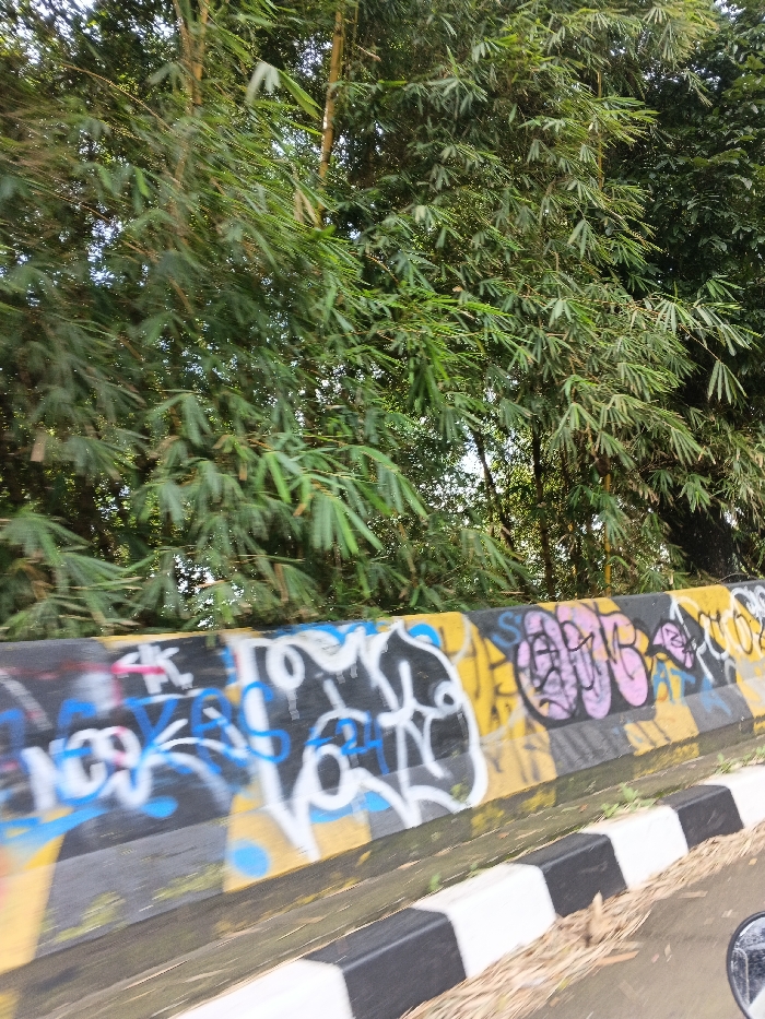 A view of dense bamboo trees overlooking a concrete barrier. The barrier is covered in colorful graffiti, including blue, pink, black, white, and yellow markings. The bottom edge of the barrier has black and white striped blocks. There are some scattered leaves near the bottom right corner of the image.