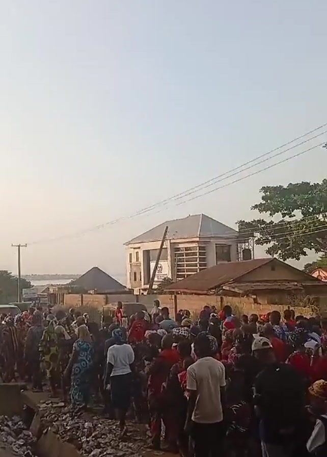 A crowd of people is gathered on a street. The crowd is diverse in age and attire, with some wearing traditional clothing and others in casual wear. They appear to be in a residential area with buildings and vegetation in the background. A sign is visible that says "UNITY ONITSHA". The sky is overcast.