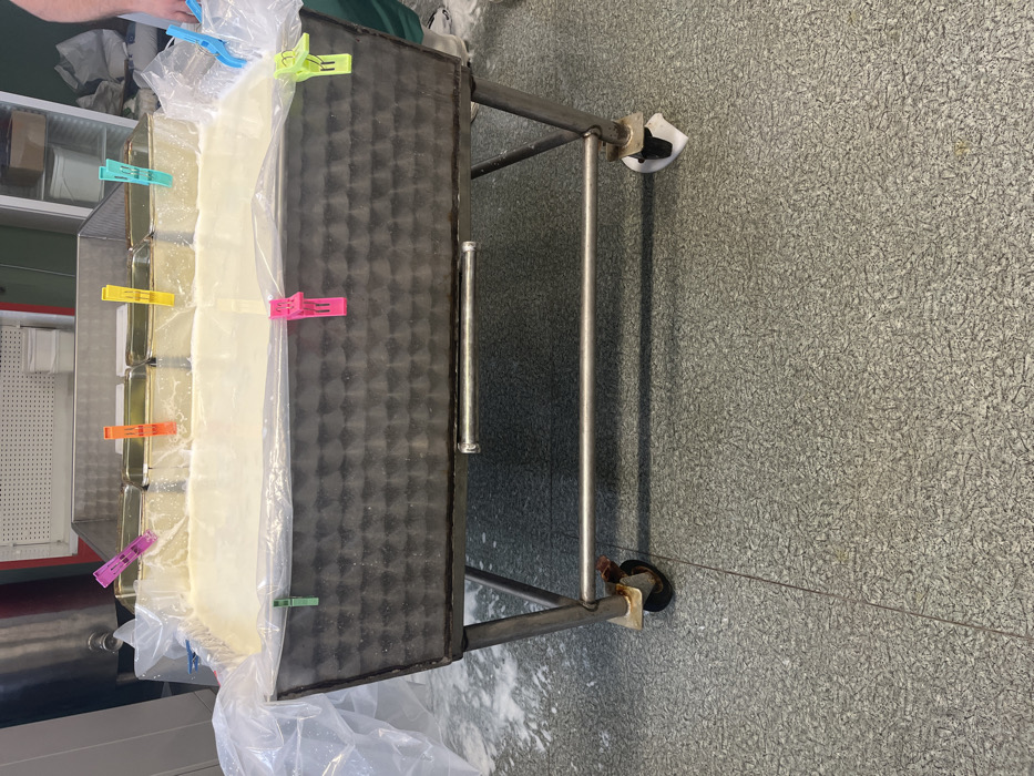 An industrial stainless steel mobile vat, roughly waist-height, is centrally positioned on a textured, light gray floor in a commercial food processing facility in Plovdiv, Bulgaria. The vat's exterior is dark gray with a patterned, possibly insulated, surface. It rests on a stainless steel frame with four legs and black caster wheels, one of which exhibits minor rust. A horizontal bar extends between the vat's legs. The vat contains a substantial volume of a white, opaque, viscous liquid substance, nearly filling it. A clear plastic liner covers the interior of the vat, draped over its edges and secured by eight colorful plastic clothespins (two pink, two green, one orange, one yellow, two light blue) clipped around the rim. Submerged within this liquid are at least five smaller, rectangular, stainless steel containers, also filled with the white substance. Two of these internal containers feature colorful clothespins (one purple, one orange) clipped to their edges. The background reveals parts of a commercial environment, including stainless steel piping and white modular shelving units. White liquid splashes are visible on the floor to the left of the vat. A human arm, clothed in a green long-sleeved garment, is partially visible on the far right, near the vat's upper edge.