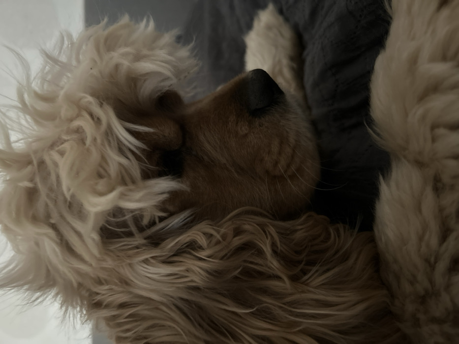 A close-up image depicts a domestic dog resting indoors. The animal, likely a Cocker Spaniel or similar breed, is positioned in profile, facing right, with its eyes closed or obscured by fur. Its body and face display light brown (tan/caramel) curly fur, while a prominent mass of significantly lighter, almost blonde, highly textured curly fur forms a distinct fringe over its forehead. A black nose is visible at the end of its snout, accompanied by discernible whiskers. The dog's forepaws are partially visible, resting on a dark gray, quilted or textured fabric surface, which appears to be a blanket or cushion. The background consists of a blurred, lighter-toned, plain surface. No specific visual cues are present in the image to determine a precise location within the city of Strasbourg, France; the scene depicts a generic interior environment.