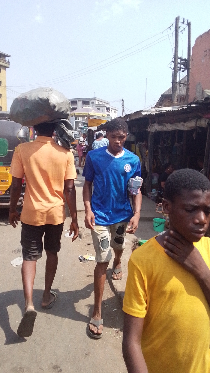 A bustling outdoor market street with three men as primary subjects. One man carries a large sack on his head, wearing an orange shirt and shorts. Another man in a blue Chelsea soccer jersey and ripped shorts walks beside him. A third man in a yellow shirt stands to the right, partially in frame, with his hand on his neck. Street vendors and a vehicle are visible in the background, alongside market stalls with corrugated metal roofs and overhead power lines. The scene is bathed in bright daylight.