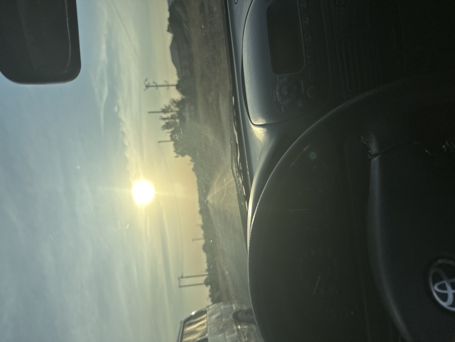 The image captures an exterior scene from the interior perspective of a vehicle in Nabatum, Nigeria, during either sunrise or sunset. The bright, low-hanging sun is prominent on the horizon, slightly left of the image's center, creating significant glare across the vehicle's dusty windshield. A light-colored minivan or bus is partially visible on the left side of the unpaved or dirt road, heading away from the viewer. The road extends into the distance, appearing hazy under a sky with light clouds. Along the right side of the road, utility poles and sparse vegetation are present, with a distant structure visible against the horizon. Inside the vehicle, the dark dashboard, a steering wheel bearing a Toyota emblem in the lower left, and a portion of the center console featuring infotainment controls are visible, largely in shadow due to the strong backlighting. A rearview mirror is partially visible in the upper right. No individuals are explicitly seen, though the perspective implies a driver.