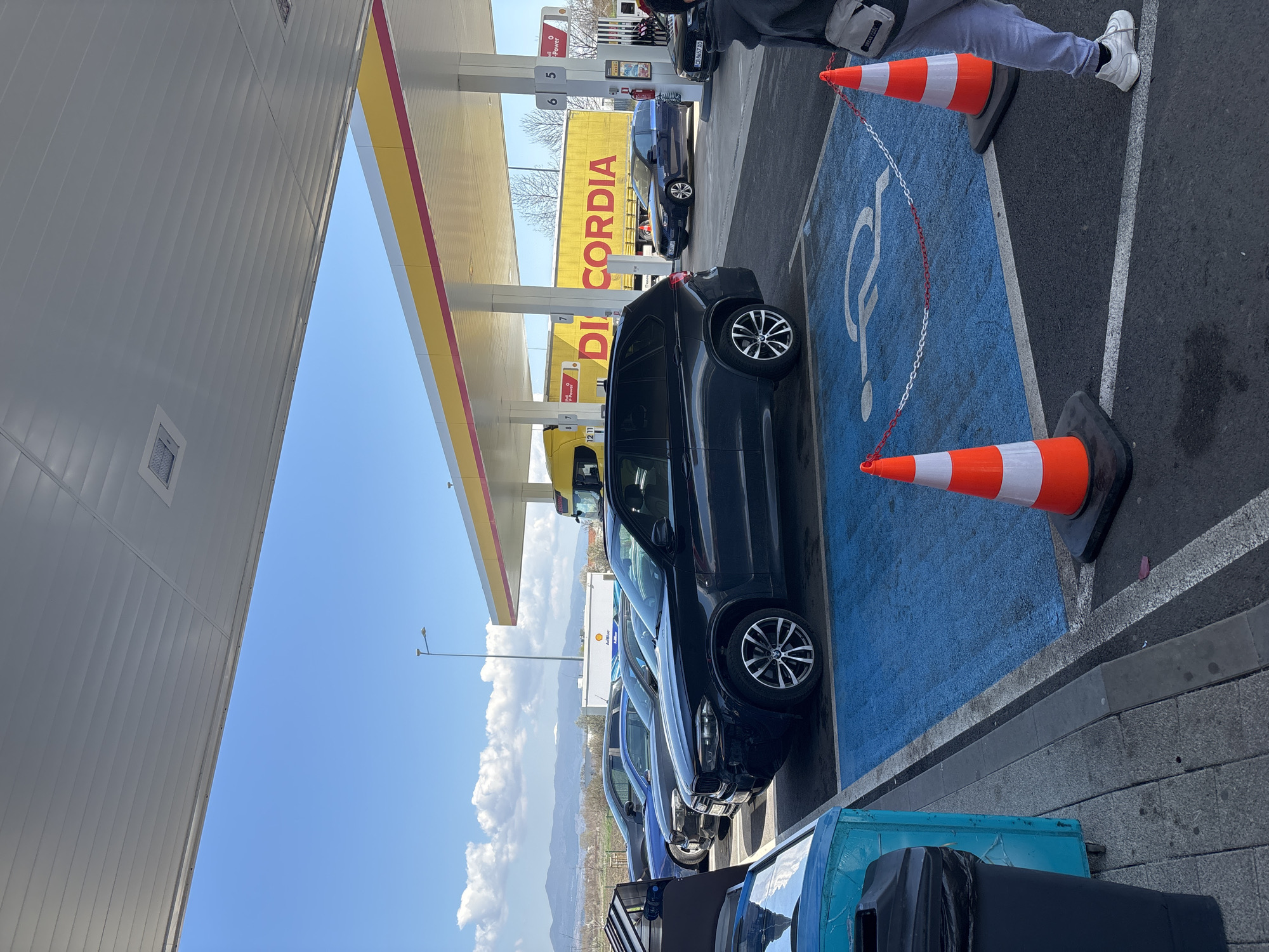 The image depicts a Shell gas station in Sofia, Bulgaria. The sky is blue with scattered clouds. There are several cars parked at the pumps, including a dark SUV parked in a handicapped spot that is delineated by blue paint and marked with a wheelchair symbol, although the spot is surrounded by orange traffic cones connected with a chain. A person wearing gray pants and white shoes stands near one of the cones. A blue waste bin is visible in the foreground. A truck with the word "DISCORDIA" on its side is partially visible behind the cars. The gas station has multiple pumps numbered 5 through 8.