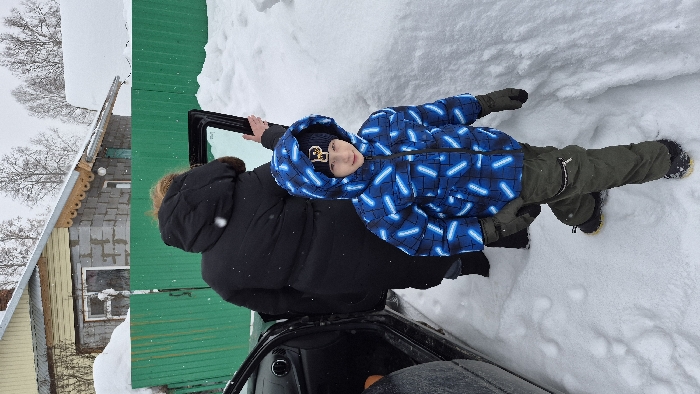 A daytime outdoor scene in Kamennyi Kliuch, Russia, depicts a snowy winter environment. The ground is covered in deep white snow with visible footprints. To the left, a dark-colored vehicle, likely a car, has its front passenger-side door open. An adult, viewed from the back, wearing a thick black winter coat with a fur-lined hood, is standing near the open car door. This individual holds a dark-framed rectangular object, possibly a windowpane, with a light-colored interior. In the foreground, a young boy, approximately 6-10 years old, stands facing the camera. He wears a blue winter jacket with a light-blue geometric pattern, dark olive-green snow pants, grey gloves, and dark winter boots with yellow soles. A dark blue knit hat with a yellow "P" emblem is visible under his hooded jacket. Snowflakes are perceptible in the air. In the mid-ground, a dark green corrugated metal fence extends horizontally. Behind the fence, a house constructed from grey concrete blocks features a light-colored gable roof with decorative wooden elements along the eaves and a small window. Bare trees and another snow-covered structure are visible in the background under an overcast sky.