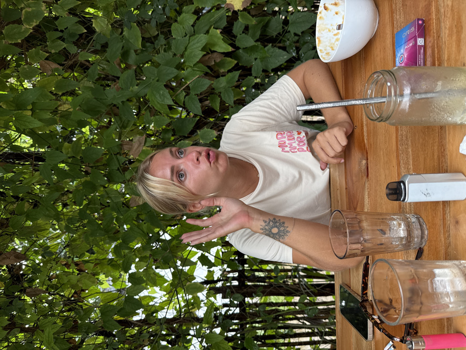 A blonde woman sits at a wooden table with foliage as a backdrop. She is wearing a cream-colored t-shirt with red lettering and has a tattoo on her forearm. Her expression is surprised with mouth open and eyebrows raised, gesturing with her right hand. Several items are on the table including two empty glasses, a phone, a pink lighter, a vape device, a jar with a metal straw, and a white bowl with food residue.