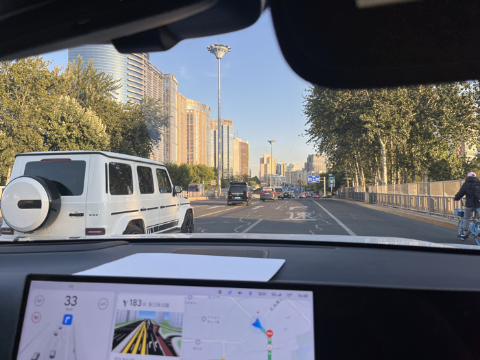 The image, captured from inside a vehicle looking forward through the windshield, depicts an urban road scene under a clear blue sky, consistent with daytime. A dark vehicle dashboard occupies the lower frame, featuring a white sheet of paper on the left and a digital infotainment screen below it. The screen displays a navigation interface indicating a vehicle speed of "33 km/h" and "183米" (183 meters) to "三环路" (Third Ring Road), along with a simulated lane view and a map. Prominently positioned in the left lane ahead of the observer's vehicle is a white Mercedes-Benz G-Class G63 SUV, identifiable by its rear-mounted spare tire, "G63" badge, and black accent stripes along its lower body. Multiple other vehicles, including a dark SUV/van, are visible further down the multi-lane road. The road features standard white line markings and appears to be a bridge or overpass, indicated by the concrete barriers and metal railing on the right side. A person, wearing a dark jacket and a pink hat, is observed riding a light blue shared bicycle on the right side of the road, adjacent to the railing. The background is dominated by a dense cluster of modern high-rise buildings, primarily glass and steel structures, some with distinctive architectural curves, illuminated by sunlight. Lush green trees line both sides of the road, and a tall, multi-headed street light pole stands on the median strip. The scene is located in **Chaoyang District, Beijing, China**, specifically near the **East 3rd Ring Road**, as directly indicated by the navigation system showing "三环路" and the characteristic high-rise architecture of Beijing's Central Business District (CBD) within Chaoyang.