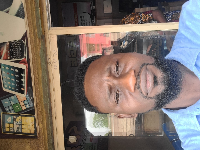 The image depicts a close-up frontal view of an adult Black male in Markurdi, Nigeria, standing before a glass storefront
