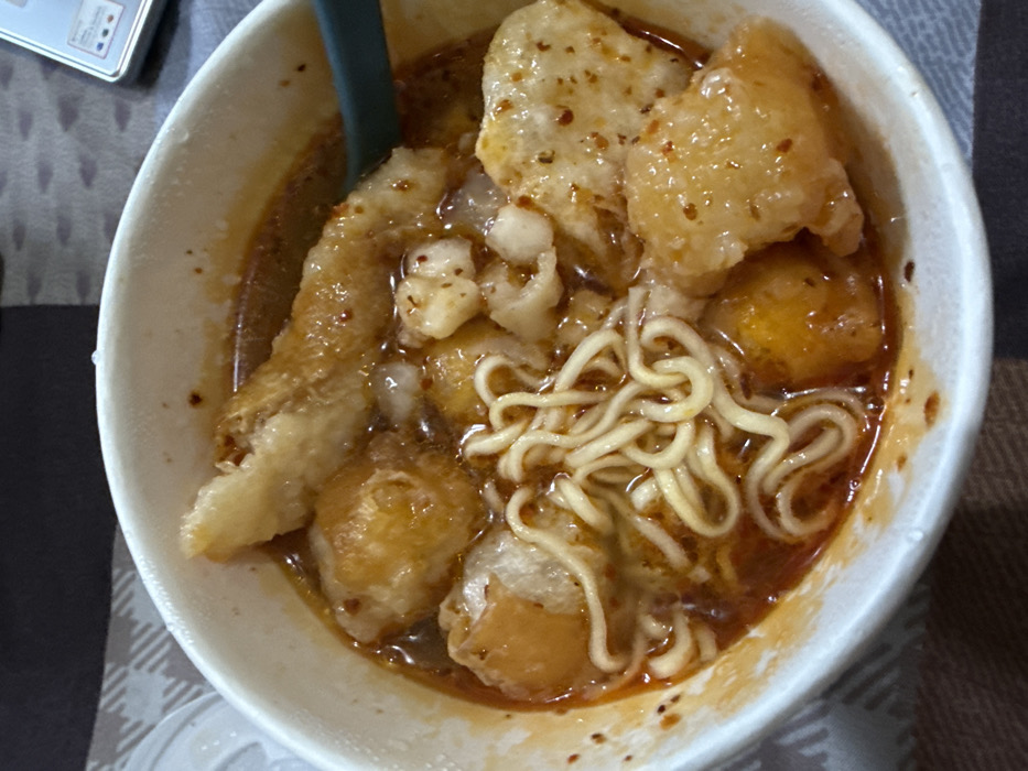 - "A close-up shot shows a bowl of noodles with several fried dough sticks and some small fried balls in a reddish broth" by FM-O4AQ23, licensed under CC BY 4.0