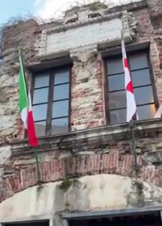 exterior of a weathered brick building. The building has two visible windows with dark frames. Above the windows, there is a stone plaque with Latin text engraved on it, framed by decorative stonework. The building's facade shows signs of age and wear. An Italian flag is on the left and a white flag with a red cross is on the right, both positioned between the ground and the windows. A doorway leads into the building, and a person is visible inside. There are also people near the doorway outside, moving around. The sky is blue with some white clouds. The camera pans up from the doorway to show the entire facade and flags.
