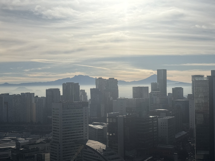 An elevated, wide-angle view of a densely built urban environment in Mexico City, Mexico, is depicted under a bright, hazy sky. Numerous high-rise and mid-rise buildings dominate the mid-ground and foreground, presenting a mix of grey, white, and dark facades with visible window patterns. One prominent mid-rise building in the foreground features a white sign displaying the phone number "55 5202 0032" and the text "RENTA DE OFICINA" (Office for Rent). In the distant background, a range of mountains, partially obscured by a significant atmospheric haze or smog, is visible. A distinct conical peak among these mountains, identified as Popocatépetl volcano, shows a visible plume of smoke or vapor emanating from its summit. The sky above is overcast with thin, wispy clouds, appearing brightest towards the top center. No discernible individuals or specific human activities are visible.