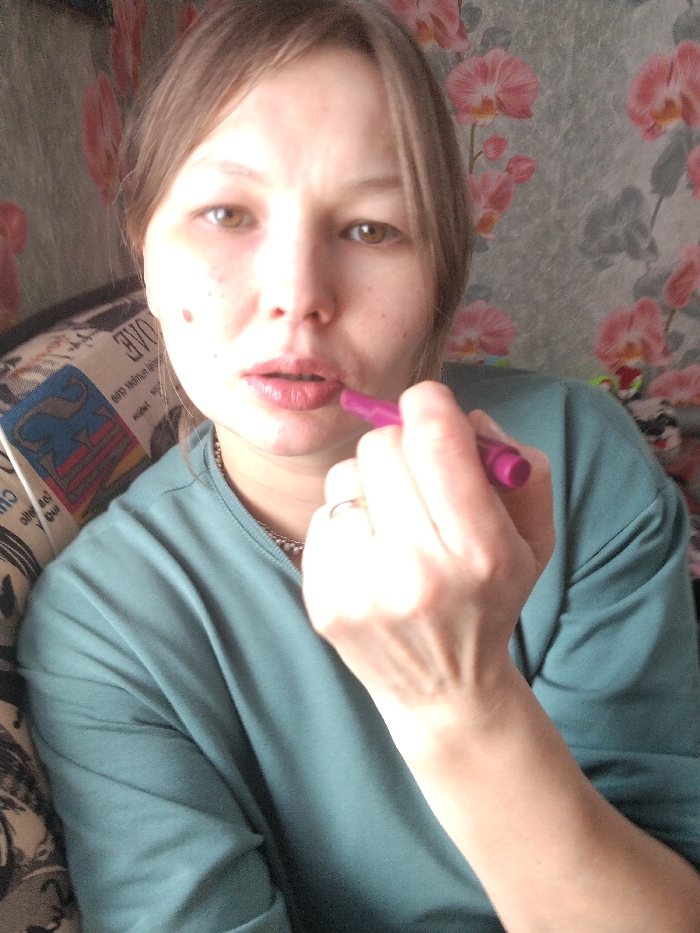 A female subject is depicted in a medium shot indoors, positioned within the city of Дойная, Russia. She has light brown hair and light-colored eyes, with a prominent mole visible on her left cheek. The subject is wearing a teal-colored, long-sleeved top and a ring on the ring finger of her left hand. Her right hand holds a magenta-colored lip crayon, which she is actively applying to her slightly parted lips. The background on the right side features wallpaper adorned with a pattern of pink orchid-like flowers. On the left side, a patterned cushion or upholstered surface is visible, displaying dark text and a stylized animal design in blue and red. The lighting is even, suggesting an indoor setting.