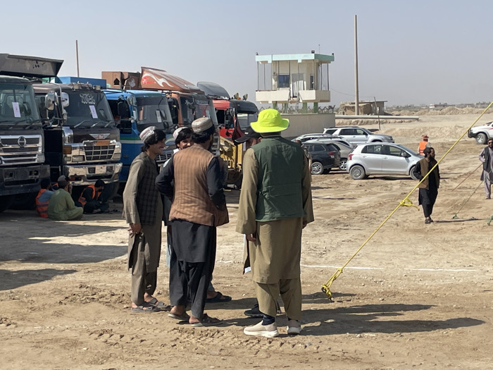 The image depicts an outdoor, dusty vehicle lot in Pir Dust, Afghanistan, under a clear, bright sky. In the foreground and midground, a group of five men is gathered, conversing. One man, seen from behind, wears a neon yellow bucket hat, an olive green vest, and tan traditional clothing. To his left, another man wears a brown vest over black traditional clothing. A third man, to their left, wears a plaid shirt and tan traditional attire, holding a brown object, and appears to be smiling. Additional men are partially visible within this group. To the left of the main group, a line of large trucks, primarily dump trucks, is parked. Two individuals in orange high-visibility vests are seated on the ground near the front of a dark truck. To the right of the central group, several passenger vehicles, including a silver hatchback and dark SUVs, are parked in an open area. Further in the background, a two-story light blue and white building, resembling a guard post or control tower, is visible, with a tall metal pole adjacent to it. The ground is unpaved and very dusty, with tire tracks and some white line markings. A yellow rope or strap with metal anchors is stretched across the dusty ground from the foreground towards the midground on the right. In the far background, the terrain appears barren and slightly elevated. Several other individuals are scattered in the background, some walking. Long shadows cast by the people indicate bright sunlight.