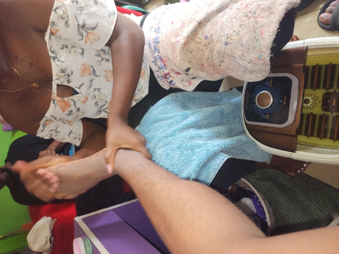 The image depicts an indoor scene, likely a salon or spa, located in Ogbogoro, Nigeria. A dark-skinned individual, identified as Person 2, wearing a white off-the-shoulder floral top and a gold crucifix pendant, is performing a foot massage on a lighter-skinned individual, identified as Person 1, whose lower left leg and foot are prominent in the foreground. Person 2's hands are clasped around Person 1's elevated foot and ankle. A light blue towel is draped over Person 2's lap beneath the foot being massaged. On the floor in front of Person 2 is a brown and white electric foot spa machine filled with water and equipped with internal rollers, displaying a digital control panel with a central circular button. Person 2's right foot, with white polished toenails, is visible near the foot spa, alongside a dark slip-on sandal. A multicolored, textured towel rests on Person 2's right leg. To the left, a small light pink container with a light green lid is placed on a purple surface, with a woven basket featuring a green and black pattern visible below. In the background, a third dark-skinned individual (Person 3) wearing a dark shirt is partially visible, also engaged in what appears to be a foot massage, with a red surface and a white object behind them. The environment includes a green-colored wall in the background and light-colored flooring.