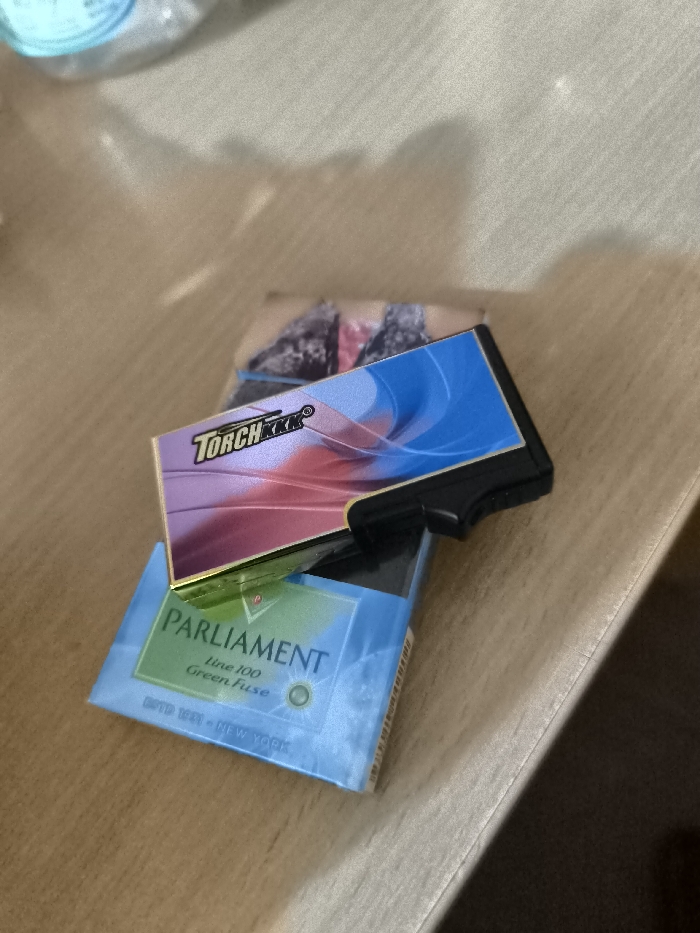 The image displays a flat lay of three objects on a light tan, textured surface. Prominently featured is a light blue pack of "PARLIAMENT line 100 Green Fuse" cigarettes. Resting diagonally on top of this cigarette pack is a black electronic lighter or similar device, featuring a multicolored faceplate with purple, pink, and blue swirling patterns and the brand "TORCHKKK®" visible. Partially obscured beneath the Parliament pack is a dark-colored cigarette pack. In the upper left background, a translucent plastic object, possibly a bottle, is partially visible. No individuals are present. The specific location within Pakhtakor, Uzbekistan, or any other city/country, cannot be determined from the visual evidence provided.