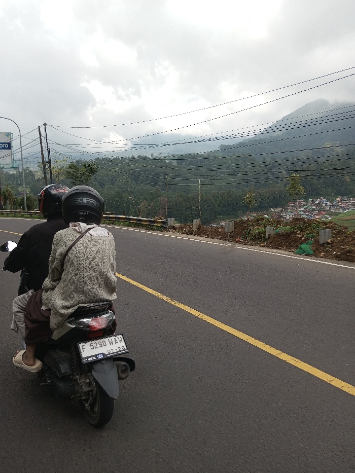 - "An overhead-rear perspective photograph captures two individuals riding a dark-colored Yamaha scooter on an asphalt road in Chendenbji, Bhutan, under an overcast sky" by FM-9wSr13, licensed under CC BY 4.0