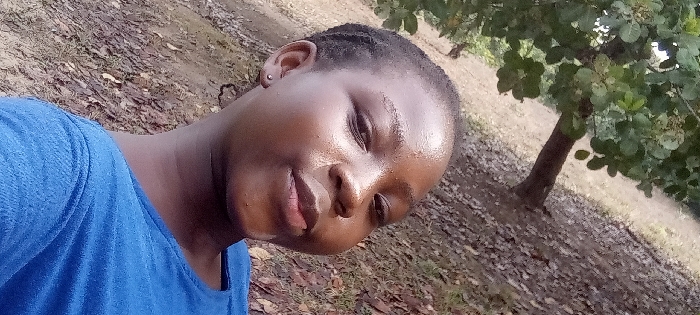 A close-up, tilted portrait features an individual with dark skin and short, dark hair, wearing a blue garment. A silver stud earring is visible in their left ear. The individual's face exhibits a natural sheen, possibly from oils. The background depicts an outdoor environment with light brown soil covered by scattered dry leaves. A tree with a brown trunk and green foliage is visible on the right side of the frame. The scene is illuminated by natural daylight. The location is Konike, Nigeria.