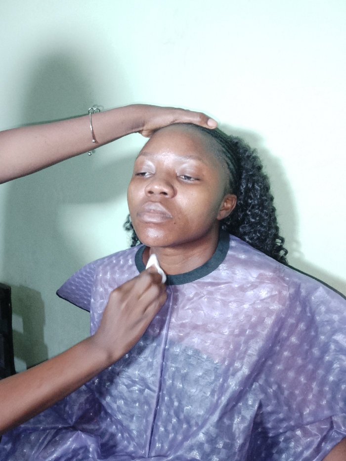 A person sits with a purple smock around their shoulders, their eyes cast downward. A hand holds a white pad against their neck. Another hand rests on top of their head, stabilizing them. The individual has dark, curly hair. The background is a plain, pale green or white wall. The scene suggests a beauty treatment or makeup application in progress.