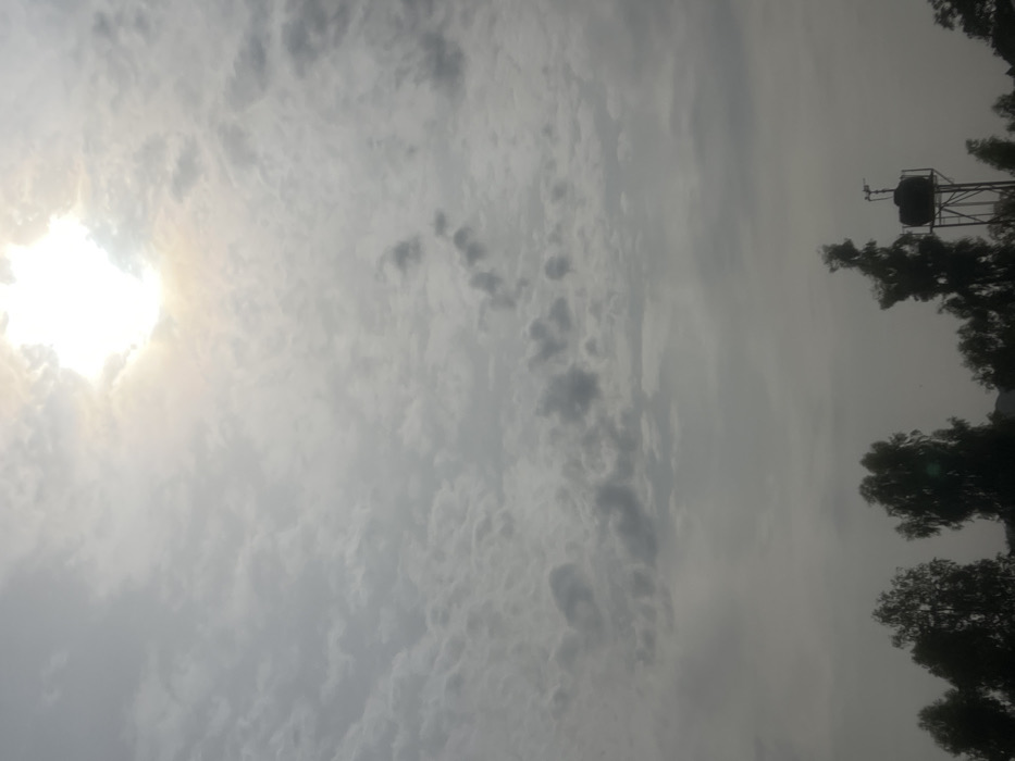 The image depicts an outdoor daytime scene in Bukuru, Nigeria, dominated by an expansive sky and a silhouetted treeline. The upper right quadrant of the sky features a bright, diffused sun, partially obscured by an extensive layer of grey and white altocumulus or stratocumulus clouds that cover the entire visible sky. The lower portion of the image shows the dark, indistinct silhouettes of numerous trees, appearing as a dense canopy along the horizon line. To the right, above the treeline, a dark, cylindrical water tank is visible, mounted on a slender metal support structure. A small, dark fixture or antenna protrudes from the top of the water tank. No individuals or specific activities are observable.