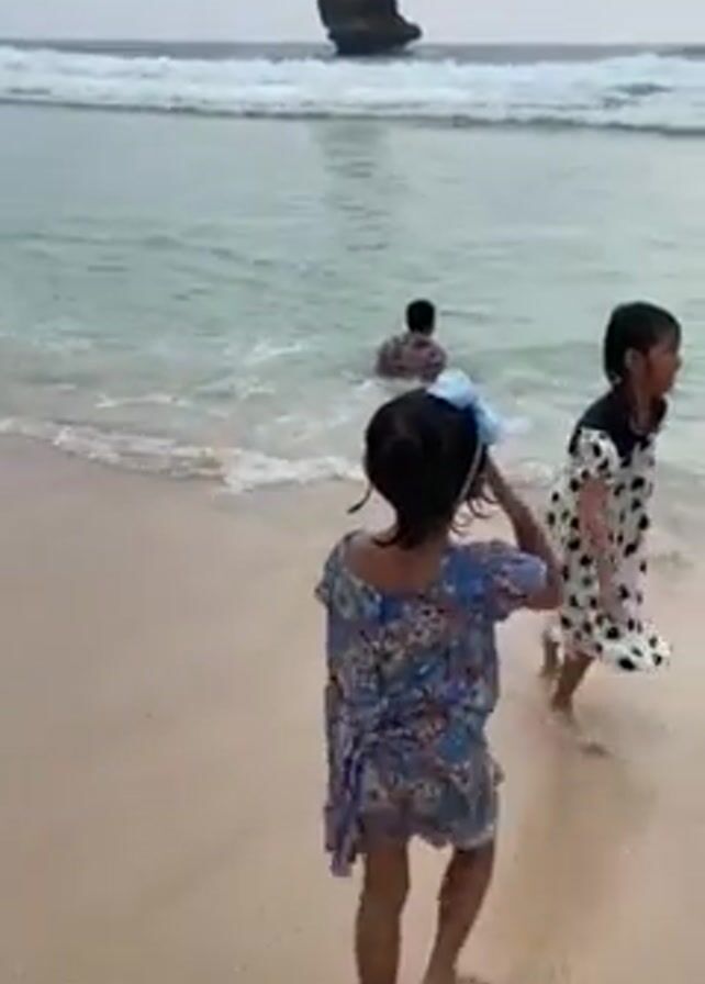 The scene is a beach on an overcast day. Two young girls are seen playing on the sandy shore, running toward the water's edge. One is wearing a blue floral dress and a blue bow in her hair, the other has on a black and white polka dot dress. They interact with two adults, a man and a woman, who are sitting in the shallow water. The water is clear and calm with gentle waves. A large, rocky formation rises from the sea in the distance. The beach appears clean and well-maintained.